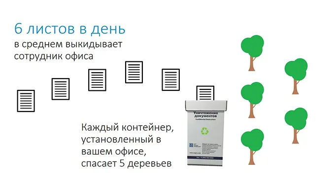 Ежегодно для изготовления бумаги уничтожается примерно 10 000 км2 леса. ОСГ внедрила в комплекс своих решений услугу конфиденциального уничтожения документов. Благодаря социальной ответственности и активности клиентов ОСГ и ОСГ, клиенты имеют возможность уничтожать документы методом шредирования с разной степенью секретности, и только после этого шредированный материал отправляется на вторичную переработку.